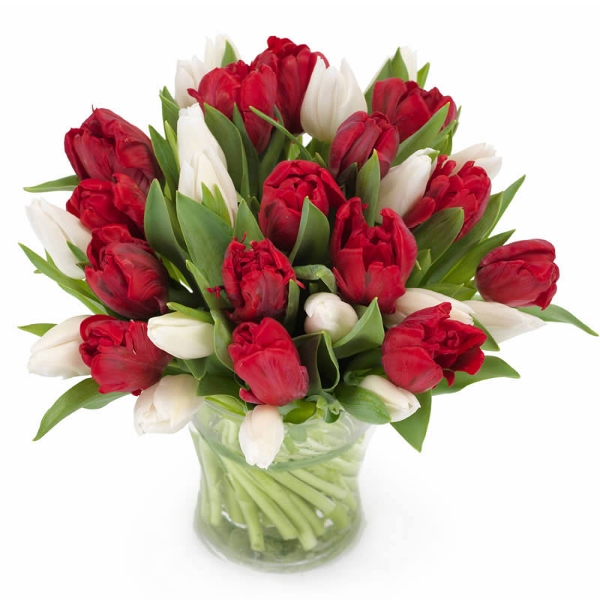 Haal de warmte in huis met dit liefdevolle tulpenboeket in rode en witte tinten. Zorgvuldig gebonden door onze lokale bloemisten bij jou in de buurt!