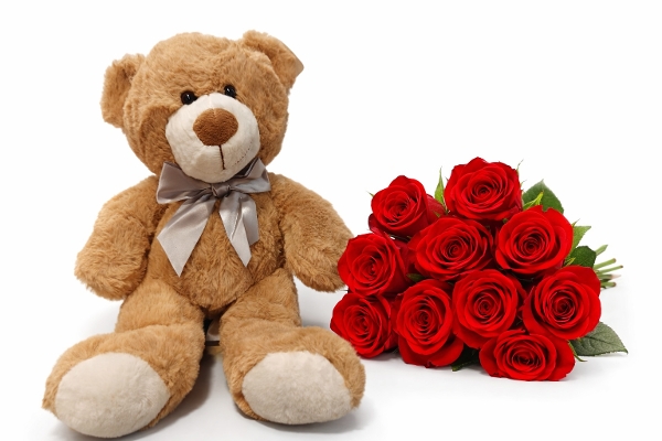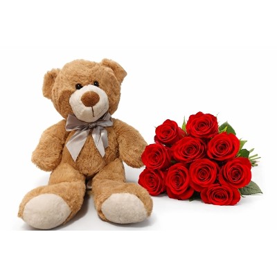 Een mooie knuffelbeer met 10 prachtige rode rozen