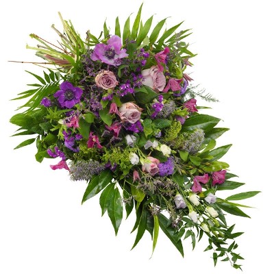 Een harmonieuze mix van paarse, lila en roze bloemen tegen een achtergrond van weelderig groen. Deze prachtige en elegante rouwschoof heeft bloemen zoals rozen, anemonen, eustoma en clematis, die bewondering, vrede en herinnering symboliseren. De mix van zachte kleuren straalt een gevoel van troost en elegantie uit en biedt troost tijdens momenten van herdenking. Met onze focus op kwaliteit en betaalbaarheid biedt deze elegante paarse, lila & roze boeket een uitzonderlijke waarde voor je hartverwarmende gebaar.