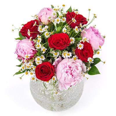 Twee favoriete bloemen - rozen en pioenen - en twee favoriete kleuren - roze en rood. In één boeket in perfecte harmonie... Charmant! Wie ga jij verwennen vandaag?